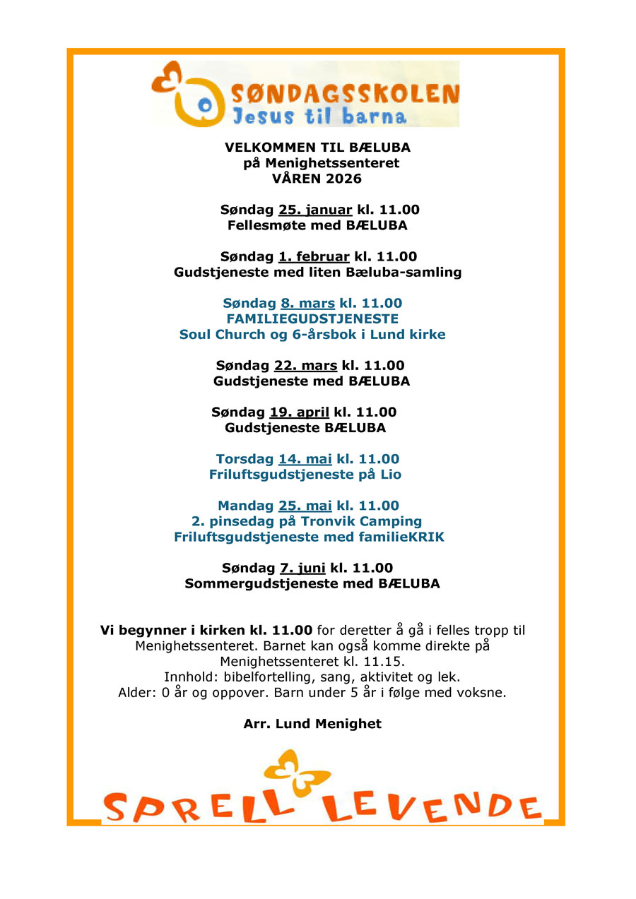 De søndagene det er Bæluba, men ikke gudstjenenste, møter alle direkte på Menighetssenteret kl. 11.